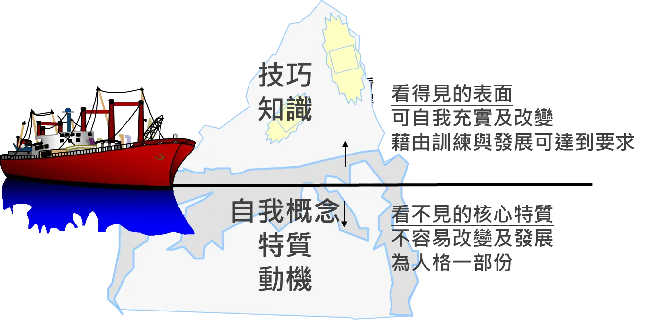 依據Spencer & Spencer(1993)提出冰山模型(iceberg model),認為職能是一連串能力的綜合,像一個巨大的冰山,包含水面下與水面上兩個部分:水面下為個人潛在基本特質,例如動機、特質、自我概念屬於較不易為人發現;而在水面上則為知識與技能,容易被人發現同時也是可以透過訓練與發展方式去獲得這些知識與技巧。